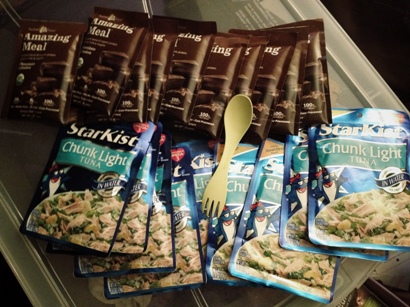 I am continuing to pack for the trip and this evening I tried to come up with a type of food plan. Typically, I try to have a couple protein items (tuna pack, power bar, protein pack) per day to supplement the simple meals I eat with the villagers or as a fallback in case I don’t get a meal. Most of the time I do get fed by the host village (it is part of the agreement) but it is always good to be prepared. In addition, the regions I stay in are very poor so the meals are usually a starchy carb and my body is used to having lots of protein each day. This time, since I will be on the ground for 40 days, there is no way I can fit enough food in my backpack so I am planning to pack enough so I have one source of protein every other day. The smallest items are my “Amazing Grass/ Amazing Meal” protein packs (yup, taste like grass….and a wee bit of dirt which they try to make you think is “chocolate”…uh huh, they can’t fool me). Although it is the easiest to pack, 20 servings of the grass would not be fun so I am packing half grass, half tuna. Tuna is my favorite protein source because it gives me the salt I need to restore some of what I sweat out during the work day and it is packed with protein.