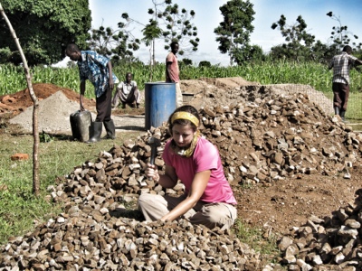Using a hammer to break down the rocks into usable pieces of aggregate for the concrete slab (latrine site)