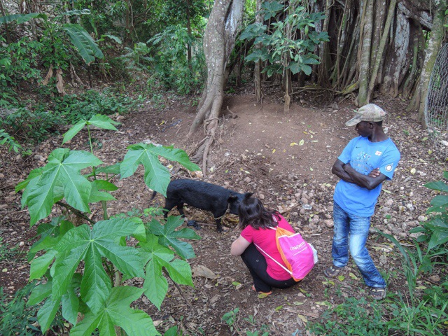 Below is a photo of Helene checking the health of a pig in Jacmel: