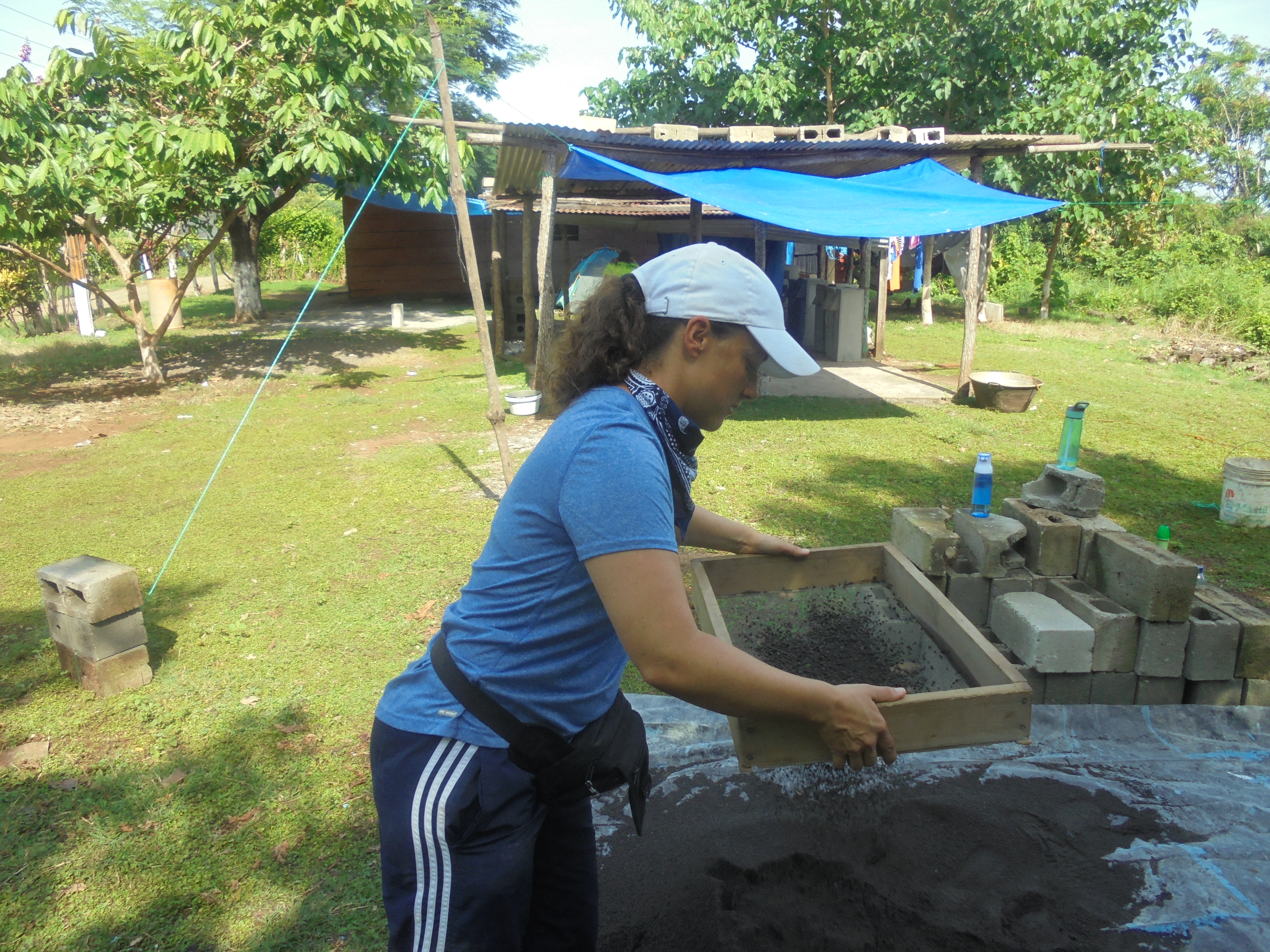 Jen sifting sand that we use in our concrete mixture for the water filters and fuel efficient stoves