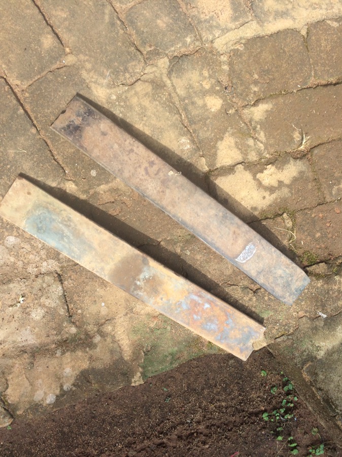 After three days of no progress in depth, we took a break (this was also after one and a half weeks of drilling at this particular site). I bought some truck leafspring locally and then carried it with me on about 6 different buses. My plan? Take the leafspring to Obule so Collin Rosser, his trainees, Emma and Dan (Water for All International) could fabricate a tool for the GI Pipe to help with the rock.
