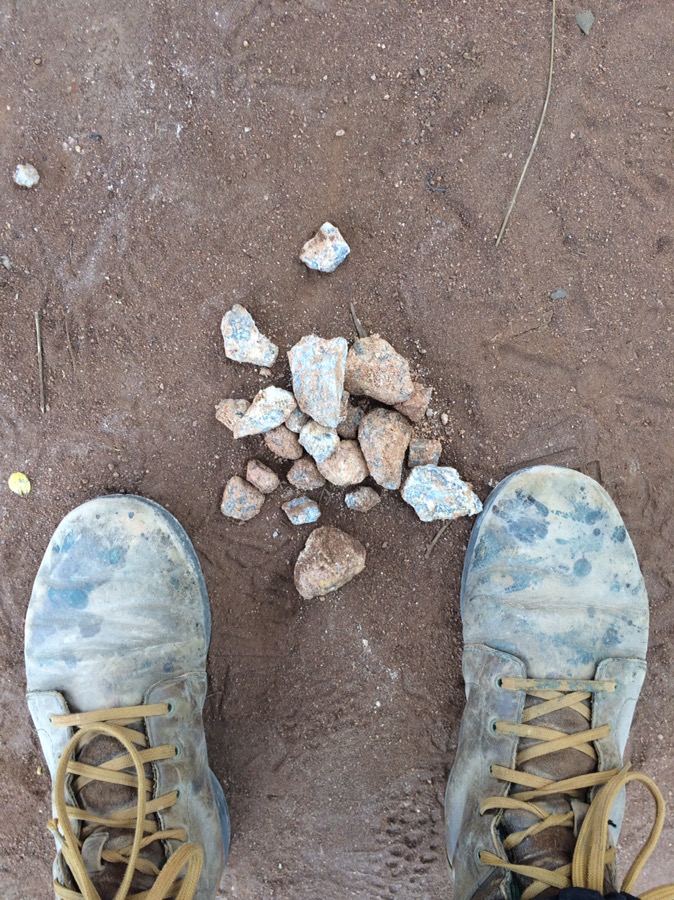 It took over an hour to assemble the 90′ of GI pipe and lower it into the borehole to test “bulldozer.” It worked well to break apart the quartz-like rock, but lowering it into the hole, we knocked a lot of the soil from the sidewalls into the  bottoms of the borehole so we had to clean it out with the auger. Unfortunalty, we pulled lots of pieces of rock out of the hole, but the auger bit kept getting caught and couldn’t progress far.